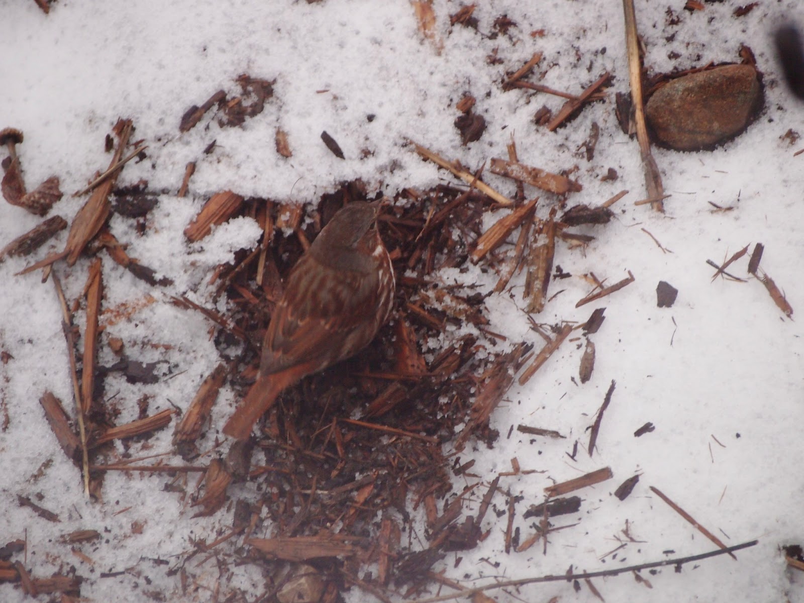 Under our big pine tree out back I noticed a speckled bird kicking away at the ground with both feet. I later noticed the same type of bird under the neighbor's pine, and one making a mess of our mulch in the front yard. They had a rusty color, with a patch of that color blushing under their eyes, and stripes along their bellies. I haven't seen one like this before so it took some investigating but I think they might be the red Fox Sparrow. The underbrush-kicking, rusty color, and tummy speckles seem to fit what my book described. If that's what they really are, then they are passing through to summer in northern Canada.